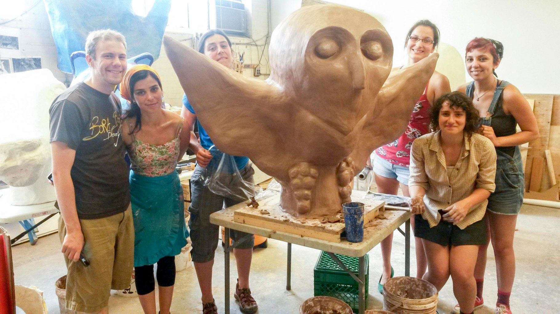 From left to right: 1) The 2014, Public Space Performance program Apprentices begin the building of the Animal Nature puppets under the guidance and design of Artistic Director, David Anderson. The group includes Sara Ahmadieh, Gavin Bowerman and Darla Contois 3) Clay and Paper Theatre Music Director, Dr.Chris Wilson and musician, Bruce McKinnon during at 2014 performance of Animal Nature. 3) Back at Clay and Paper Theatre’s old Strachan Ave studio, the 2014 crew celebrate the completion of Owl. The group includes Gavin Bowerman, Dana Prieto, Anna Sapershteyn, Darla Contois, Ruthie Pitka-Jones and Sara Ahmadieh.